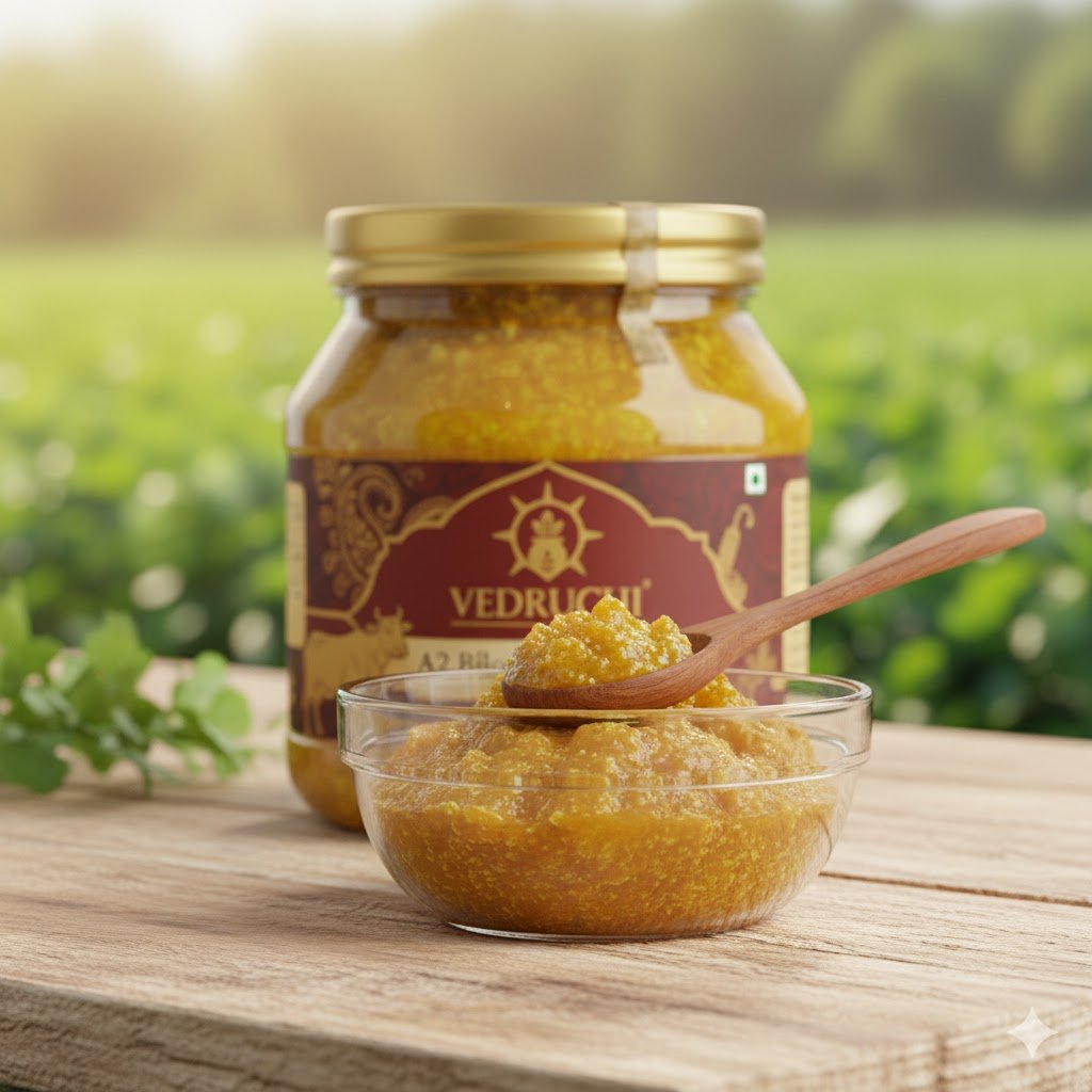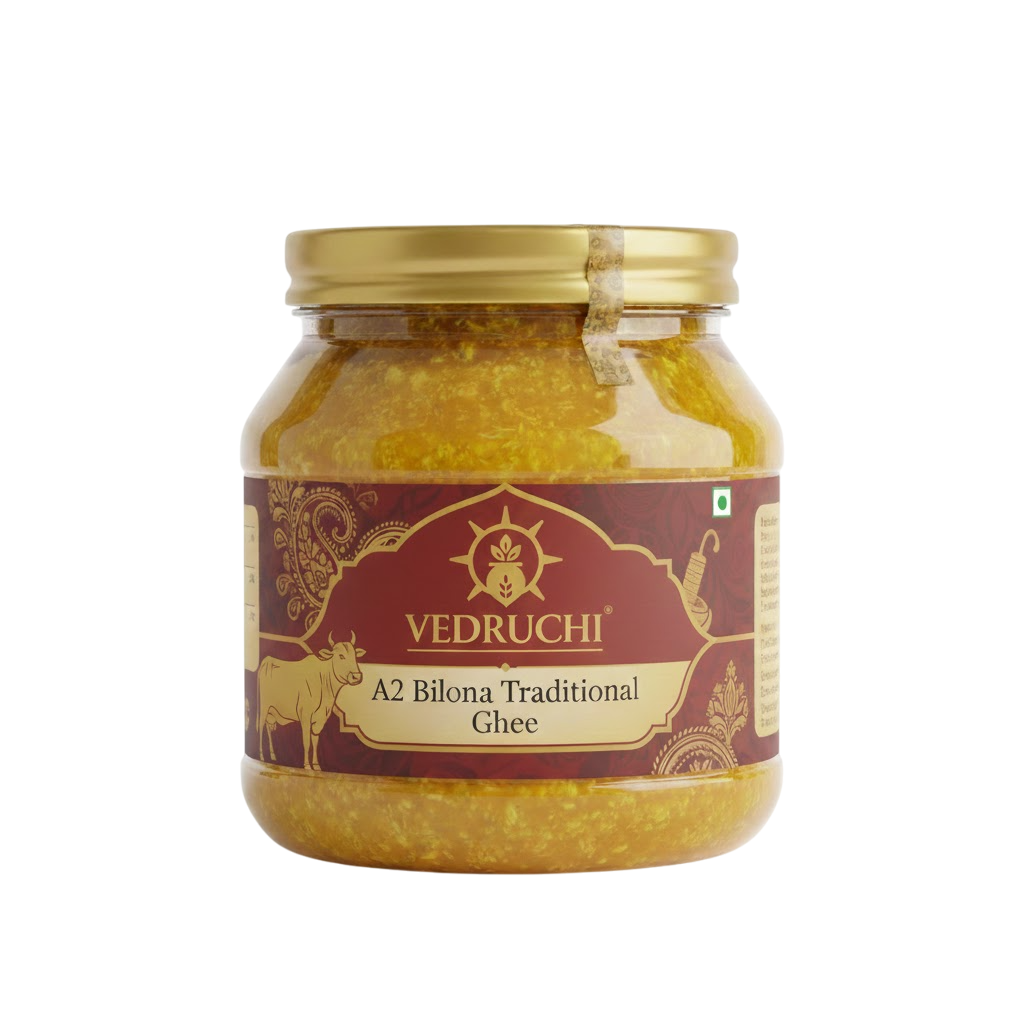 Vedruchi Bilona Traditional A2 Ghee is crafted using the age-old Indian Bilona method, where curd made from pure A2 Desi Cow milk is hand-churned to extract authentic makkhan (butter). This makkhan is then slowly simmered on a low flame to produce golden, aromatic, nutrient-rich A2 Ghee.