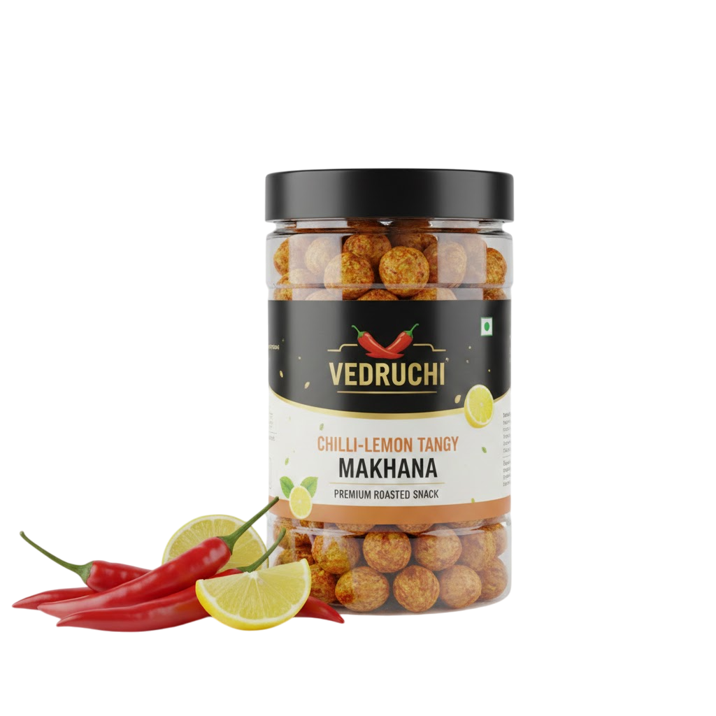 Vedruchi Chilli-Lemon Tangy Makhana brings you the ultimate balance of spicy red chilli and refreshing lemon tang, giving every bite an irresistible punch of flavour. Made from handpicked premium fox nuts, these makhanas are slow-roasted to perfection, ensuring maximum crunch without deep frying.