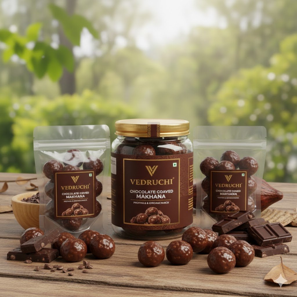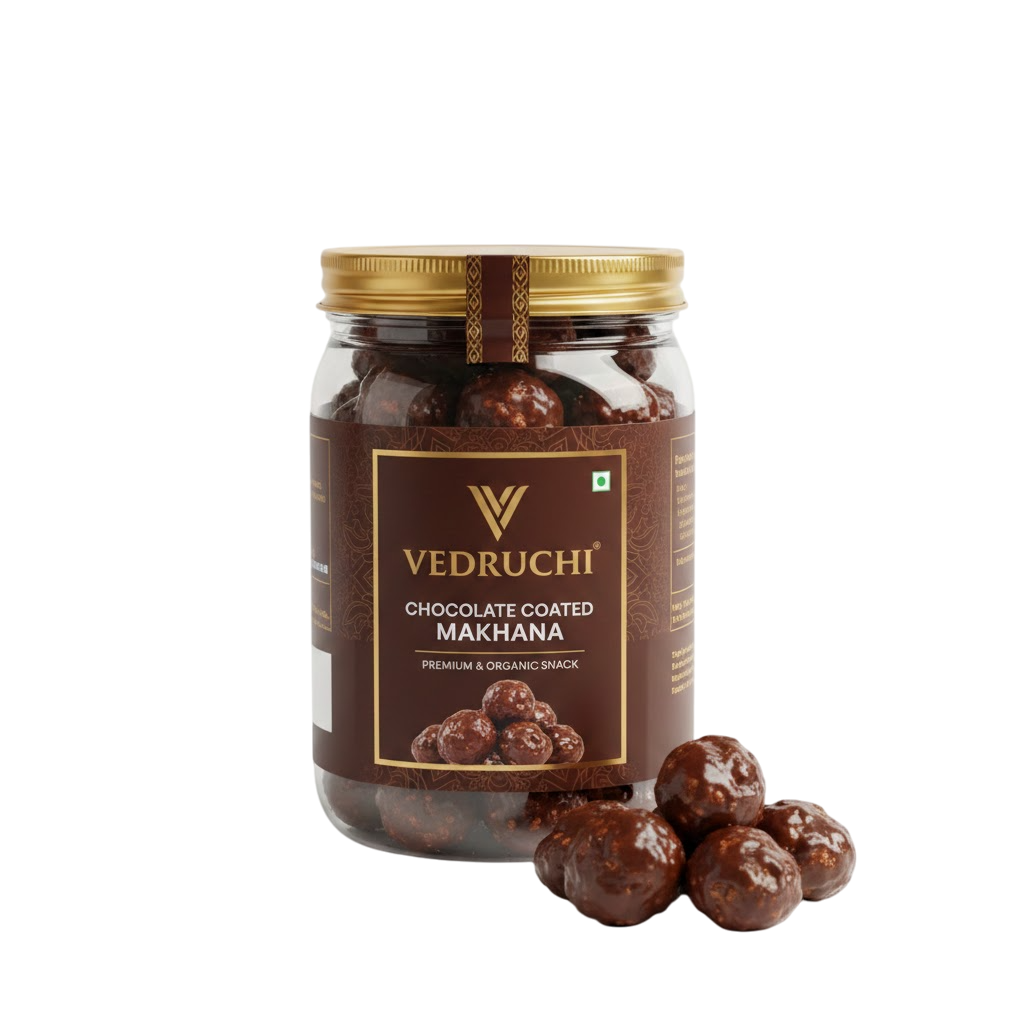 Indulge in the perfect fusion of health + delicious chocolate with Vedruchi Chocolate Coated Makhana. These premium fox nuts are lightly roasted and coated with rich, creamy chocolate, creating a crunchy, melt-in-mouth sweet snack that is impossible to resist.