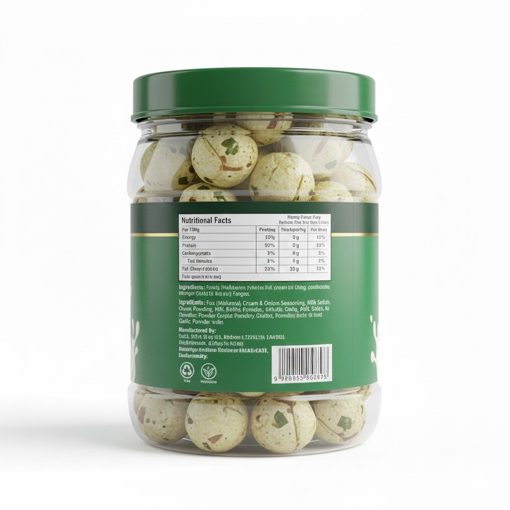 Roasted Makhana (Fox Nuts), Cream & Onion Seasoning, Himalayan Pink Salt, Edible Vegetable Oil (for light roasting), Mixed Herbs, Natural Flavours.