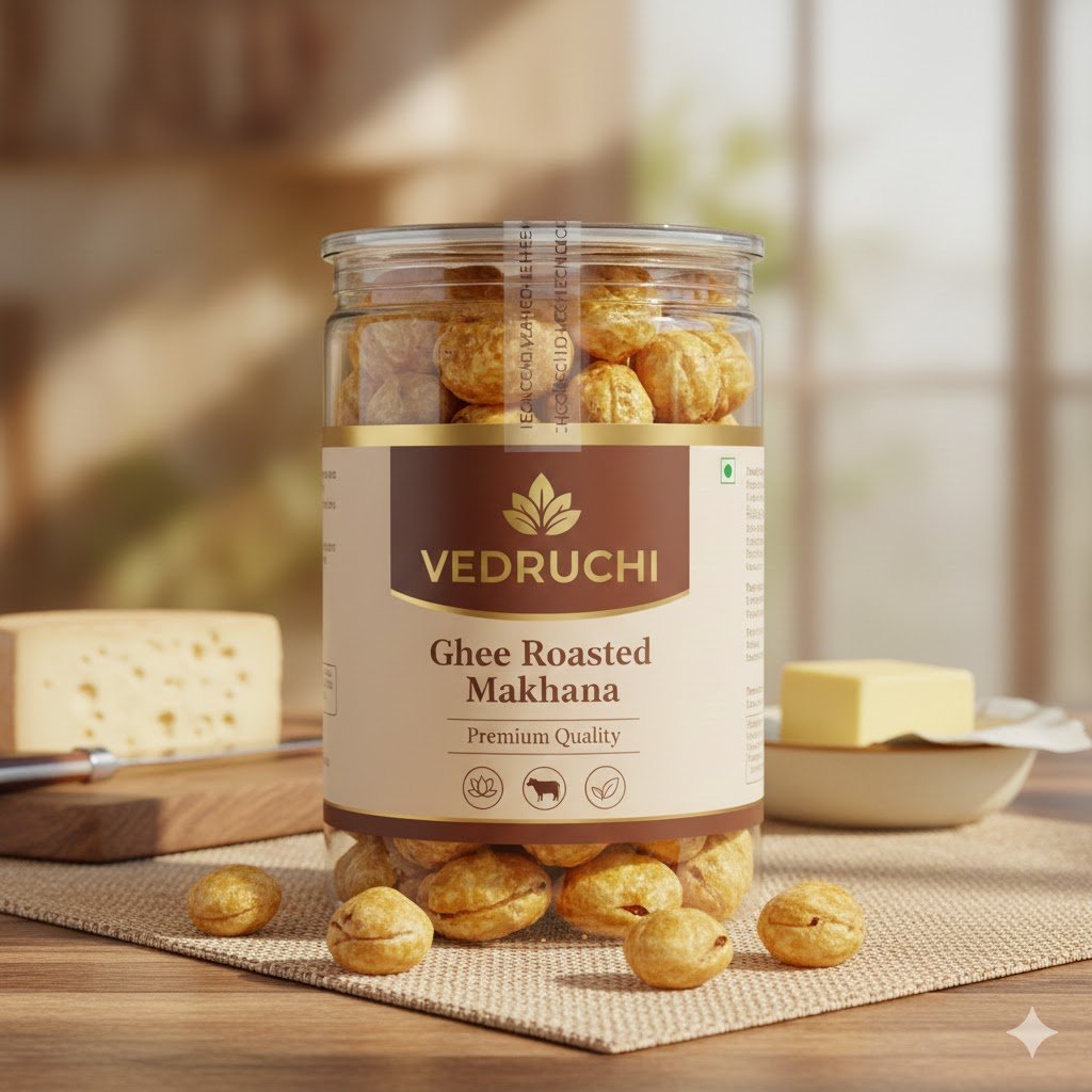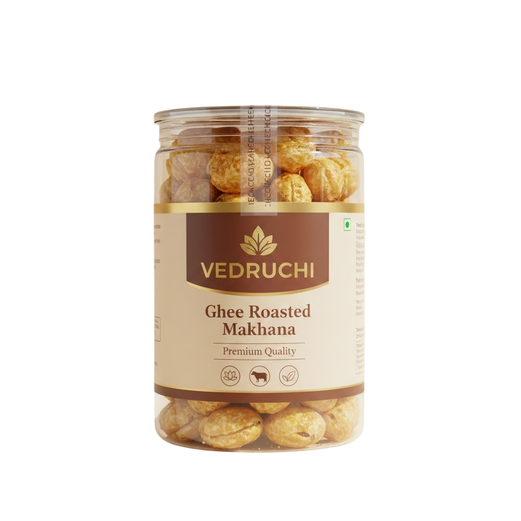 Experience the richness of pure desi ghee blended with the natural crunch of premium-grade makhana. Vedruchi Ghee Roasted Makhana is slow-roasted to perfection, delivering a delicious golden flavour and a light, melt-in-mouth texture.