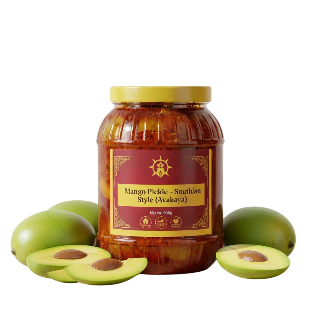 Vedruchi brings you the classic Avakaya Mango Pickle, a heritage recipe from the kitchens of Andhra & Telangana. Known for its rich aroma, fiery taste, and chunky raw mango pieces, this pickle is loved across India.