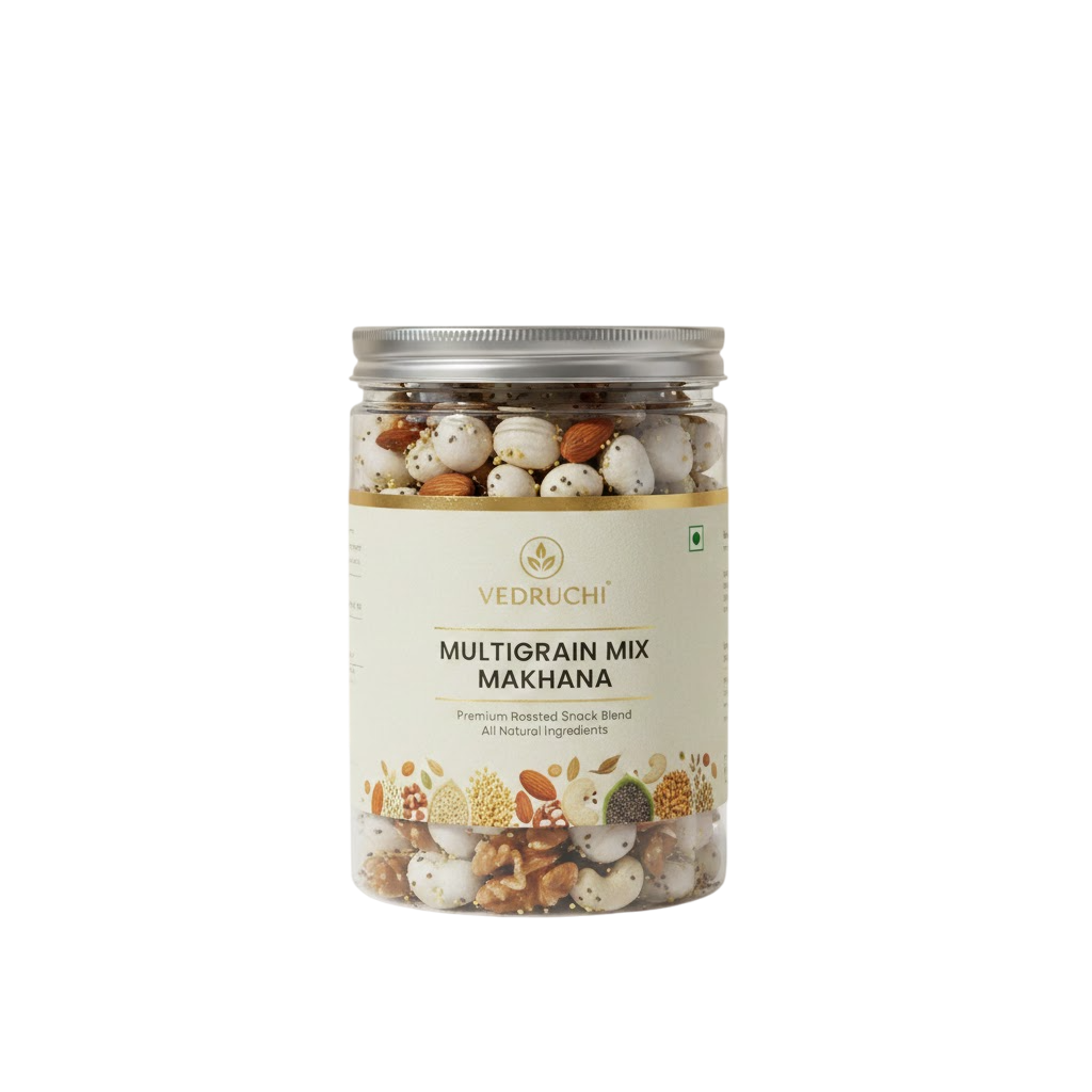 Vedruchi Multigrain Mix Makhana is a wholesome blend of roasted makhana, nuts, and nutrient-rich seeds. High in protein, fiber, and healthy fats, this guilt-free snack is perfect for fitness lovers, dieters, kids, and anyone who wants a premium healthy munch.