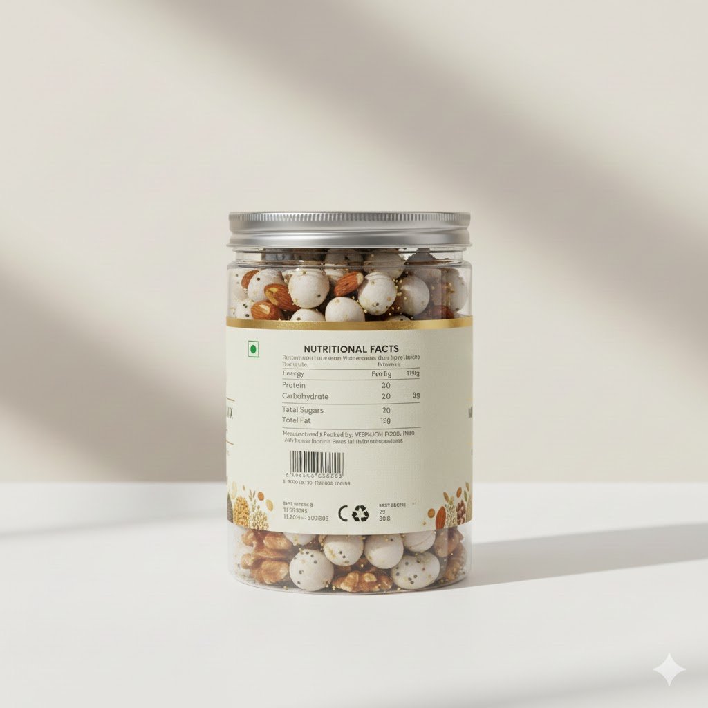 Roasted Makhana, Almonds, Cashews, Walnuts, Pumpkin Seeds, Sunflower Seeds, Flax Seeds, Rock Salt, Black Pepper, Natural Spices, Cold-Pressed Edible Oil.