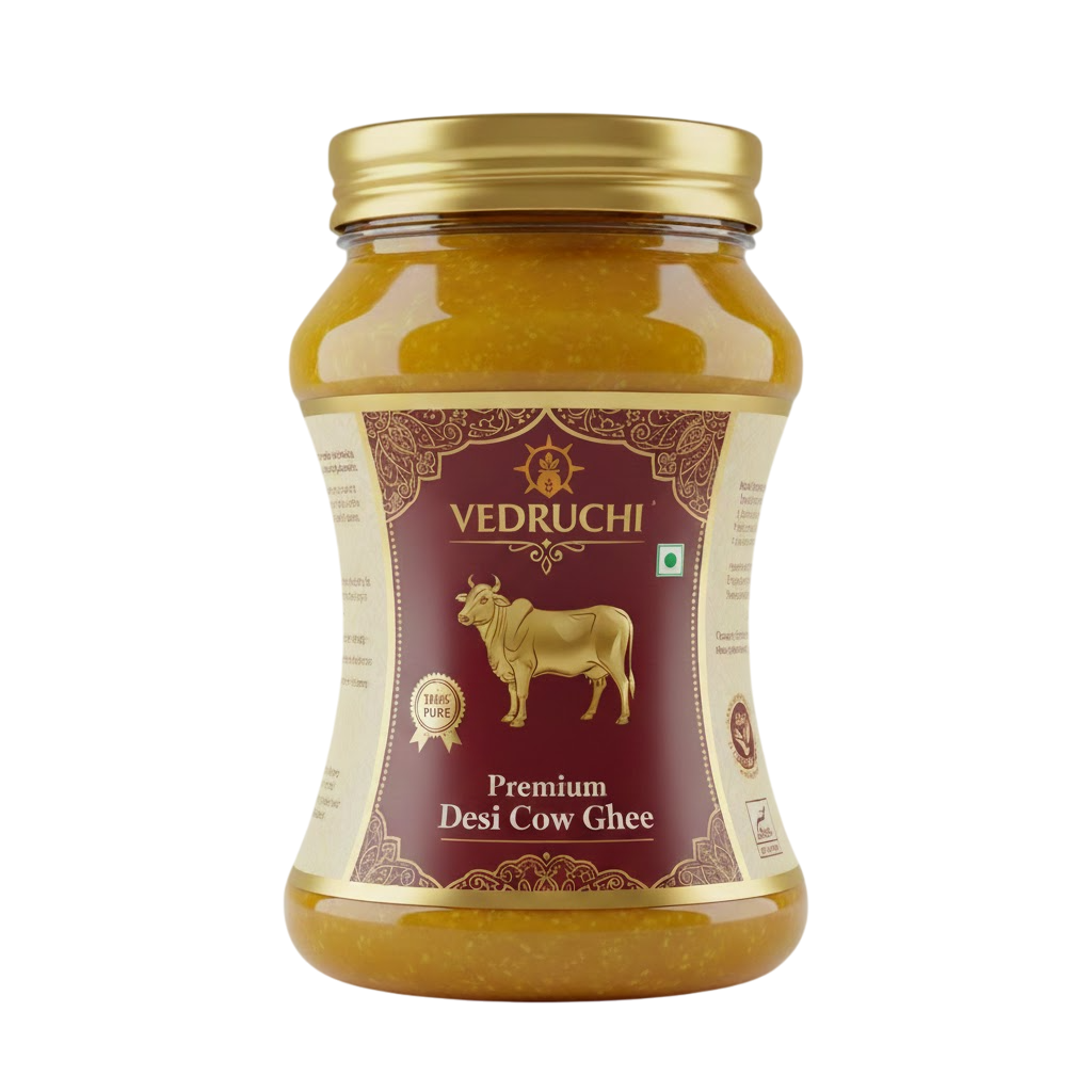 Vedruchi Desi Cow Ghee is crafted with love and purity using the time-honored Bilona method, where curd made from pure cow’s milk is hand-churned to extract butter, then slowly heated to produce nutrient-rich golden ghee.