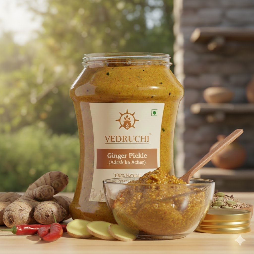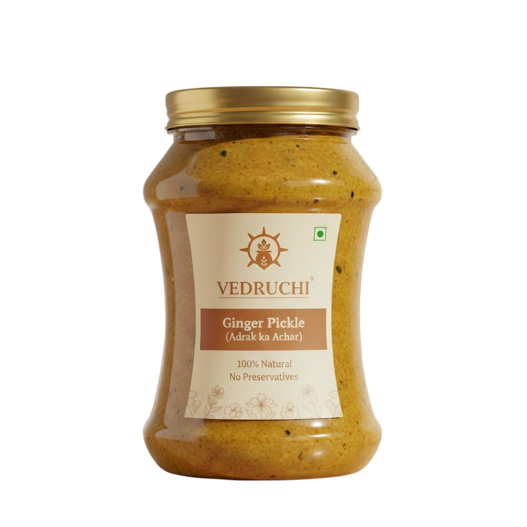 Slow-cooked in cold-pressed mustard oil, blended with sun-dried spices, and matured naturally for days, this pickle develops a deep, aromatic flavor that enhances any meal. Whether you enjoy it with parathas, curd rice, dal-chawal, or thecha-style snacks—Vedruchi Ginger Pickle makes every bite irresistible.