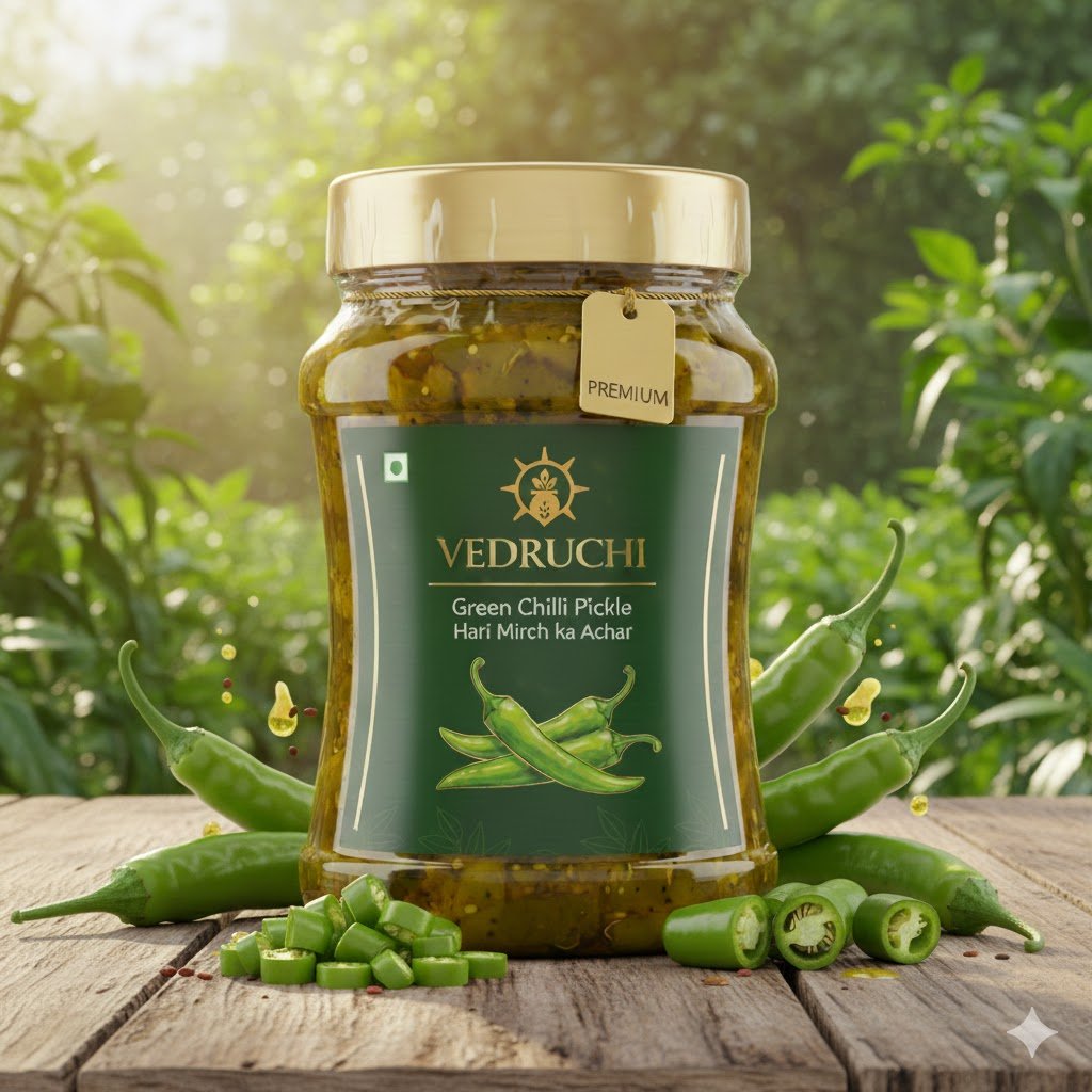 Experience the bold and authentic taste of Vedruchi Green Chilli Pickle (Hari Mirch Ka Achar)—crafted with traditional recipes and premium-quality ingredients. Every jar is prepared in small batches to ensure freshness, aroma, and unbeatable homemade flavor.